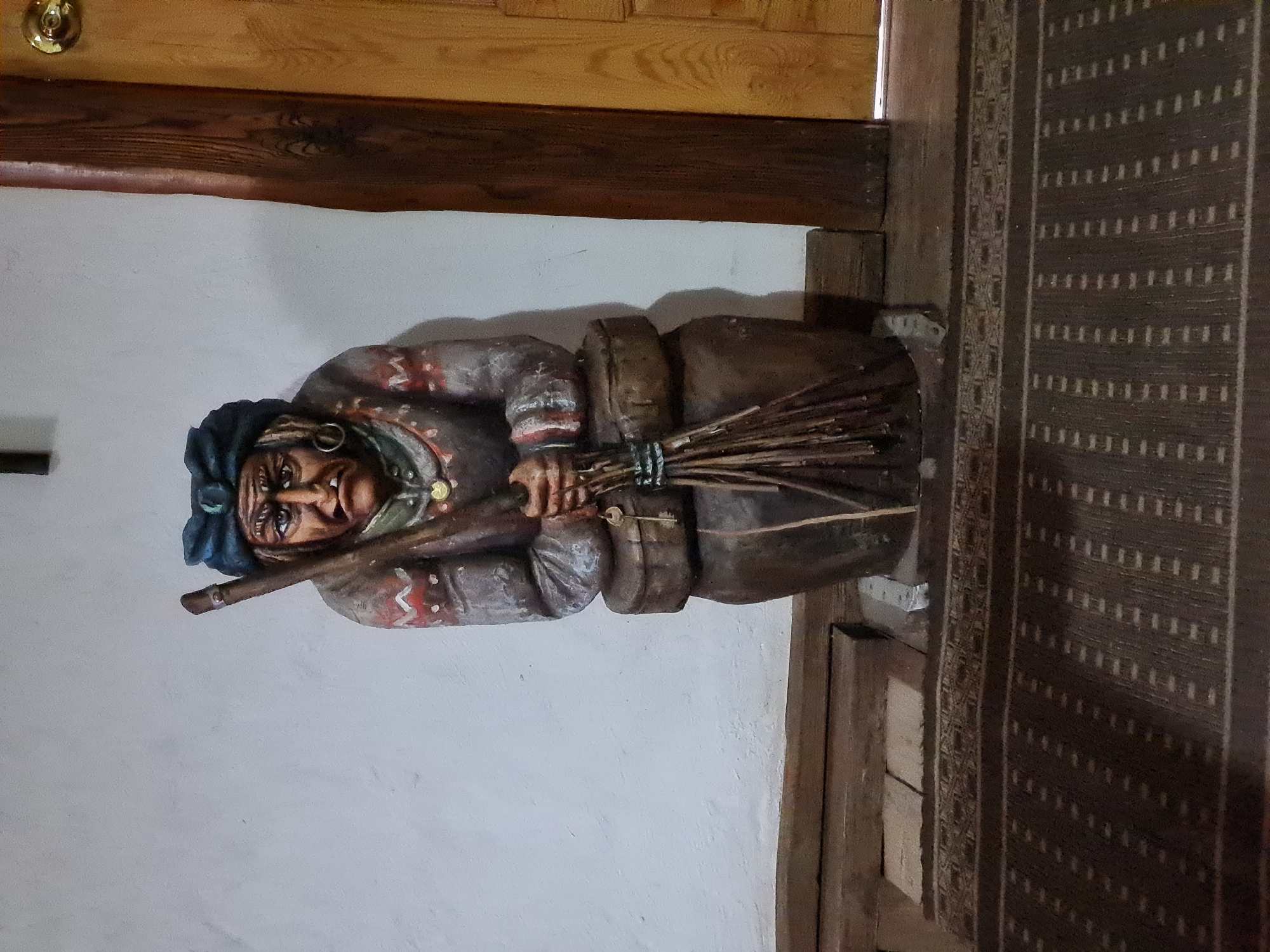 A carved, painted wooden figure of a woman with a large nose, dark hat, and a bundle of sticks over her shoulder is mounted on a wall next to a door frame