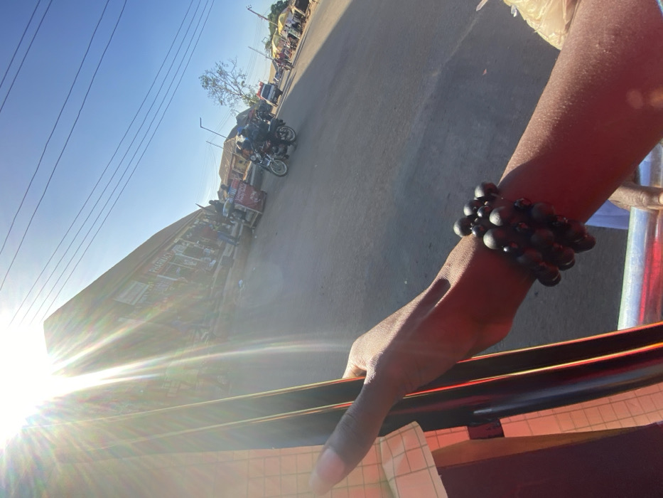 This image captures a sunlit street scene in Bukuru, Nigeria, viewed from a low perspective. In the foreground, a dark-skinned arm extends from the right, gripping a vertical two-toned metallic bar, possibly within a vehicle. The arm wears multiple black beaded bracelets. The sun is prominently positioned in the upper left, generating significant lens flare across the scene. Along the left side of the street, a long, low-rise commercial building with multiple storefronts is visible; "PHARMACY" is legible on one sign. Several individuals are present near these establishments. Overhead, multiple power lines cross the upper midground against a clear blue sky. On the paved road, two motorcycles, each carrying at least two riders, are observed. Further down the road on the right, a white van is visible, along with additional distant structures and market stalls featuring light-colored awnings. A sparse tree stands to the right of the road.