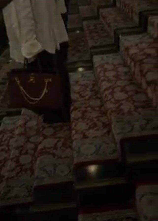 A person wearing black pants and a white shirt is ascending a staircase covered in a patterned carpet. They are carrying a reddish-brown handbag with gold chain details. The camera follows their upward movement, focusing on their lower body and the carpeted stairs.
