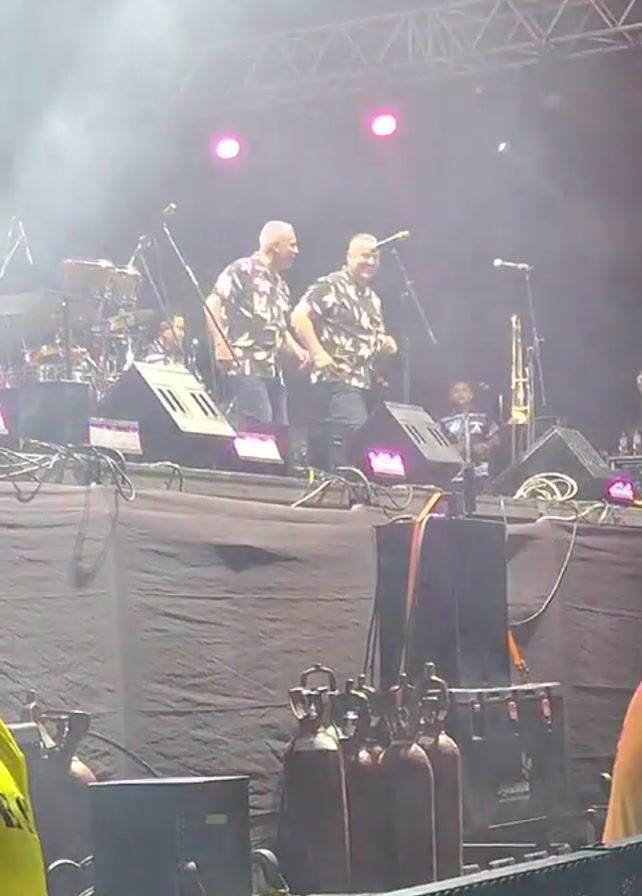 Two men, middle-aged with short hair, wearing similar black and grey floral patterned shirts, are standing and gesturing on a stage with microphones. Behind them, musicians play a variety of instruments, including drums, keyboards, and a trombone. Stage lighting is visible overhead, and there are several large metal tanks near the front of the stage. The atmosphere appears to be a live musical performance or concert. The video is shot at ground level.