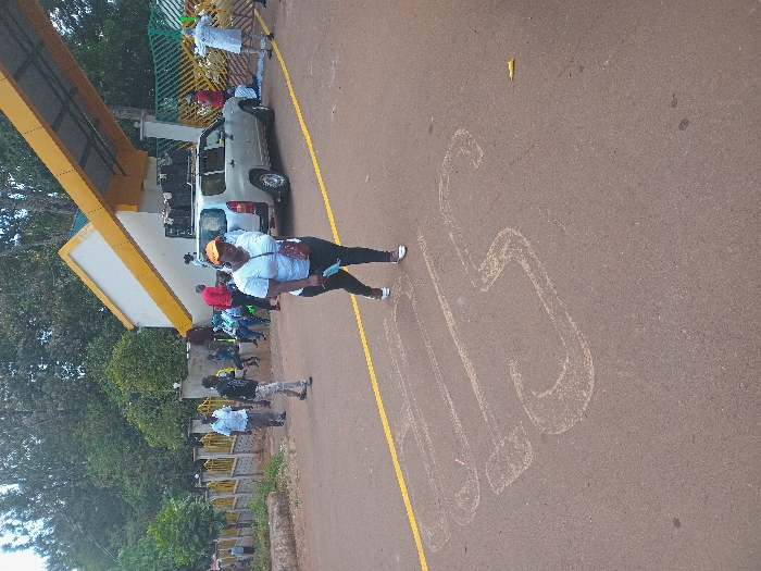 paved road with yellow lines painted on it. There is a woman in a white shirt and black pants walking on the road. She is wearing a black hat and carrying a blue bag. The woman is walking towards the right side of the image. A white minivan is parked on the left side of the image. A group of people are standing around the van. They appear to be waiting for the woman. There is a white building on the left side of the image with a yellow roof. The location is Murang'a, Kenya at coordinates (latitude: -0.719, longitude: 37.159). A large chalk drawing of the number "5" is visible on the ground.