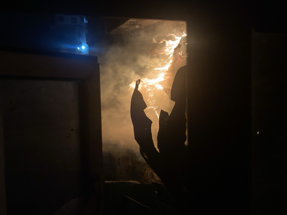 The image depicts a dark interior with a glimpse of intense fire and smoke visible through an opening