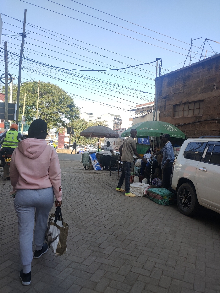 An outdoor scene in Ngong ward, Kenya, depicts a bustling street environment under a clear blue sky