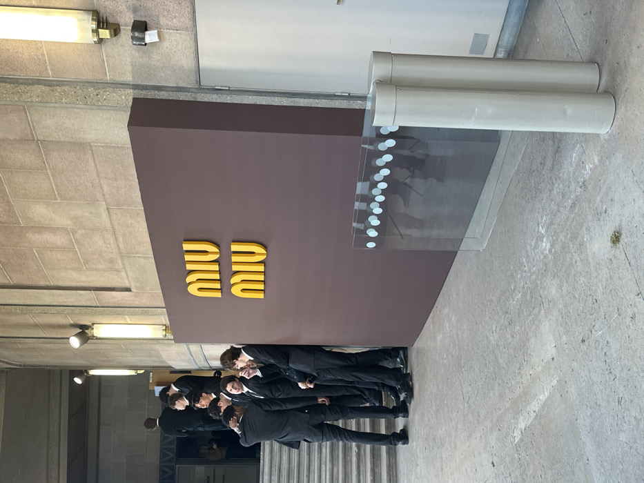 An outdoor scene depicts the entrance of a grand stone building, identified as the Palais d'Iéna in Paris, France, due to its distinctive architectural style featuring large, rectangular stone blocks, prominent vertical fluting, and broad steps. In the foreground, a large, freestanding rectangular panel, deep brown in color, displays the "Miu Miu" logo in bright yellow, three-dimensional letters, stacked vertically. To the right of this panel, a clear glass barrier with white circular decals along its top edge stands next to two tall, light-colored cylindrical posts. The ground is a light grey concrete or stone surface with minor stains. To the left of the "Miu Miu" panel, a group of approximately eight to ten young adult males is gathered near and on a wide set of stone steps leading up to the building's entrance. Most individuals are dressed in dark suits, white shirts, and dark ties. One man in the immediate foreground, facing away from the camera, adjusts his hair. Other men are standing in various poses, some appearing to converse. One individual on the steps holds a small, dark rectangular object, possibly a phone, near his face. The building facade in the background is constructed of light-colored stone or concrete. Wall-mounted sconces with long, rectangular frosted diffusers emit a warm yellow light, despite apparent daylight conditions. A plain, light-colored metal door is visible to the right of the Miu Miu sign. The scene conveys a formal event setting.
