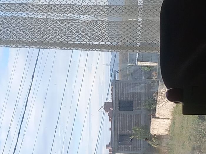 - "The image depicts an exterior scene in Tbilisi, Georgia, viewed from an interior perspective, partially obstructed by a patterned mesh curtain on the right and a dark, curved object (possibly a chair back) with a small, red, rounded component at the bottom" by FM-AY6mW2, licensed under CC BY 4.0
