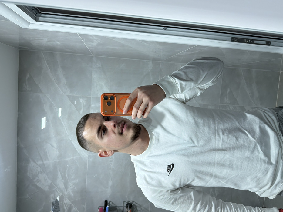 An image displays a young adult male taking a mirror selfie inside a bathroom. The male has short, buzzed dark hair with a faded cut on the sides and a small goatee. He is wearing a white long-sleeved crew-neck shirt featuring a black Nike logo on the left chest. He holds an orange-cased smartphone in his right hand, positioned to capture his reflection. The background consists of light gray rectangular tiles with a subtle marble-like pattern. Visible environmental elements include a chrome circular showerhead and a wire shower caddy containing toiletries on the left, and a white framed structure, consistent with a shower door or mirror frame, on the right. This frame includes a visible latch or handle mechanism. Overhead lighting is reflected on the tiled surfaces. The specific location within the city of Plovdiv, Bulgaria, cannot be determined from the details present in the image.