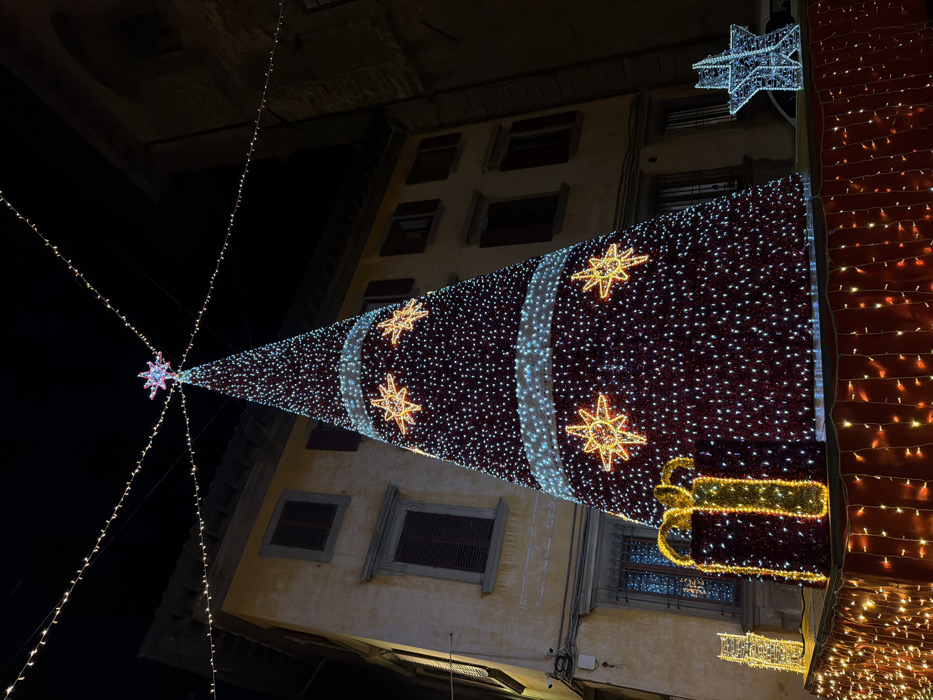 A low-angle shot captures Christmas lights suspended above a narrow street