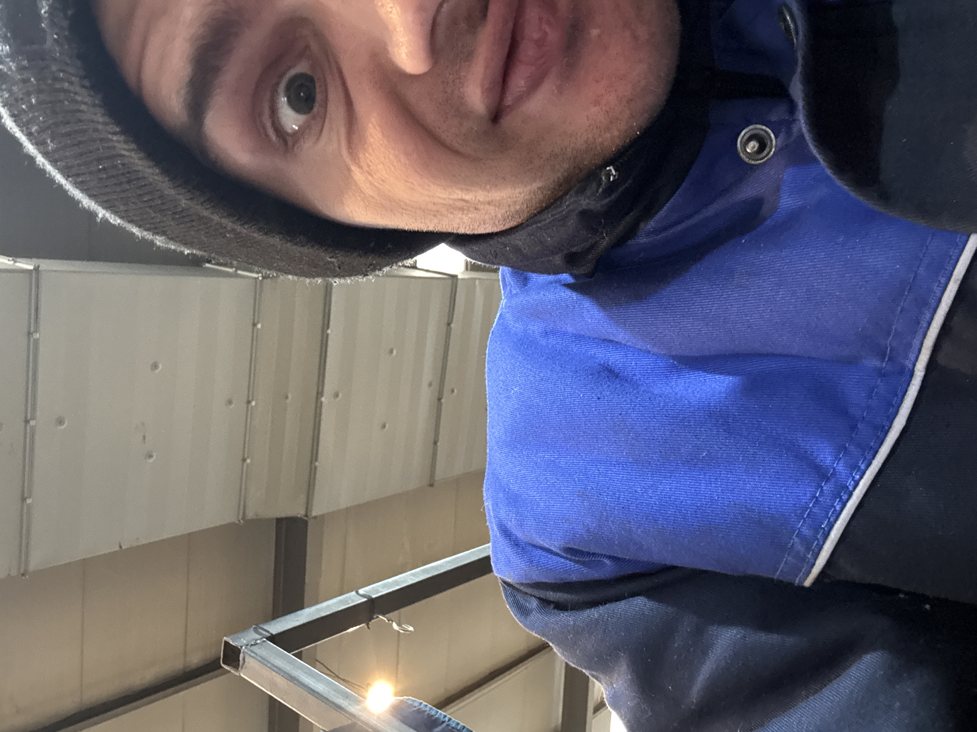 The scene depicts a close-up, eye-level selfie of an adult male inside an industrial or workshop facility in Chirpan, Bulgaria. The individual occupies the right side of the frame, facing slightly left, with his left eye wide open and his lips slightly pursed, suggesting an exaggerated expression. He wears a dark knit beanie, a blue collared work jacket with a white trim over a darker, possibly black or navy, base layer, which features a zipper detail near the neck. Visible facial features include light skin, dark eyebrows, and faint stubble on the jawline. The background, visible on the left, consists of an interior space with a light-colored, paneled ceiling that appears to be constructed from corrugated or segmented sheets, secured by visible fasteners. A dark, angular metallic structure, possibly a frame or beam made of square tubing, is present in the upper left quadrant. A bright, warm-toned artificial light source is visible suspended from or near this metallic structure.