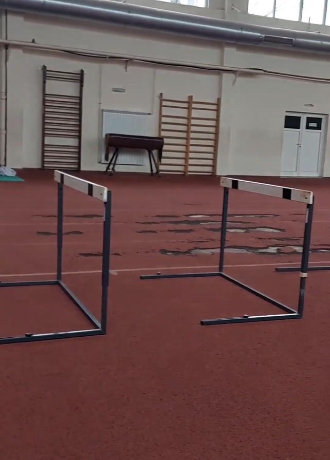 n indoor track and field facility. There are several hurdles set up on the track. A person in dark clothing walks on the track between the hurdles. Then, the camera turns to focus on a young man in a gray shirt who makes a "shush" sound.