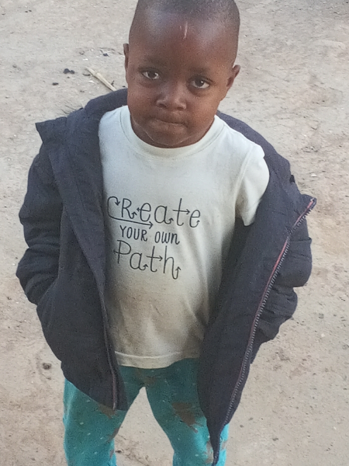 A young, dark-skinned child stands wearing a light-colored t-shirt printed with "Create Your Own Path" and a dark jacket