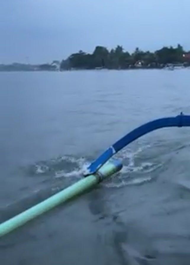 The camera is positioned on a boat, pointed towards the bow. The boat is moving through the water. The outrigger of the boat is visible on the right, with a light green float and blue supports. As the boat moves, water splashes up around the outrigger. The water is grey-blue in color. In the distance, the shore is visible, with trees and some buildings. The sky is overcast.