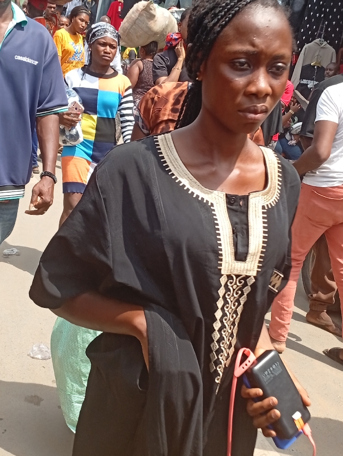 A young woman with braided hair stands among a crowd of people. She wears a black robe-like garment with intricate gold embroidery around the collar and front. Her left hand is in her pocket, while her right hand holds a black power bank connected to a blue phone with a pink cord. The background is a busy street scene with various people, clothing, and bags visible.