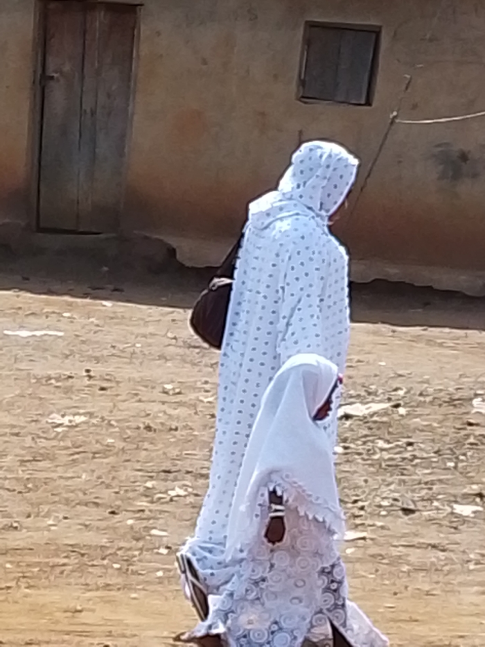 An adult and a child walk left-to-right across a dirt path in Oduma Hill, Nigeria. The adult, positioned behind the child, wears a full-length, light-colored garment with a repeating dark dot pattern and a hooded head covering, carrying a dark bag over their left shoulder. The child, in the foreground, wears a white, lacy dress and a white head covering with scalloped trim. Both individuals are partially obscured, viewed from their right side. In the background, a light brown, possibly mud or concrete, building features a weathered wooden door on the left and a small, dark rectangular window with a wooden frame on the right. The ground is dry, uneven dirt.