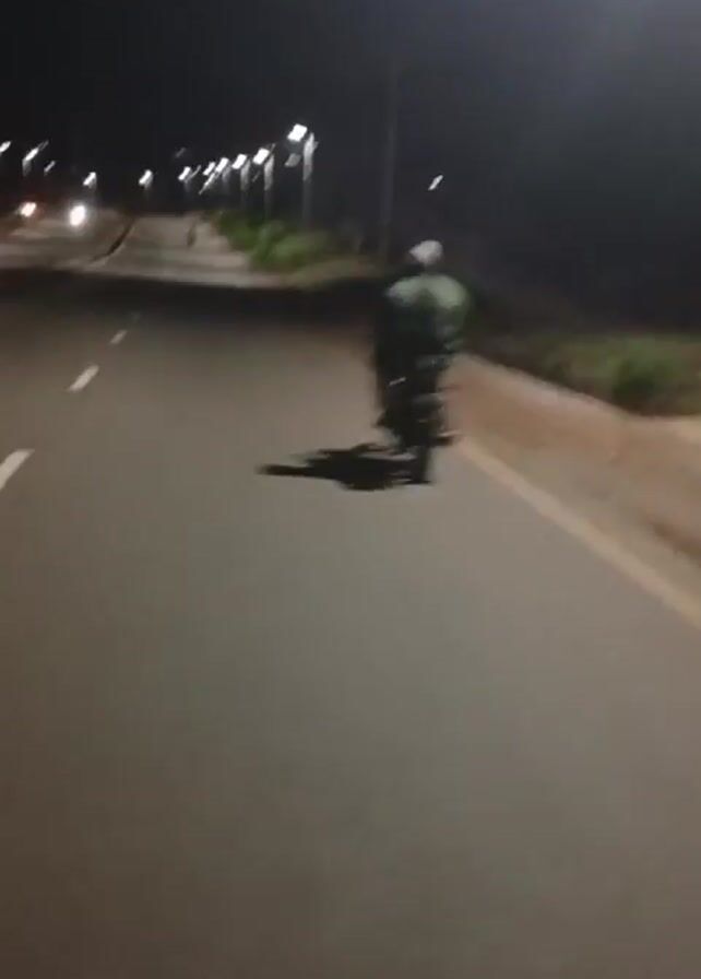 A dark video shows a road at night. A motorbike moves away from the viewer along the right-hand side of the road. The road has yellow lines marking the right edge, and white lines further to the left. There are streetlights illuminating the road and the trees/grass on the right-hand side. Two headlights are visible in the distance coming towards the camera. The camera appears to be moving along the road as well.