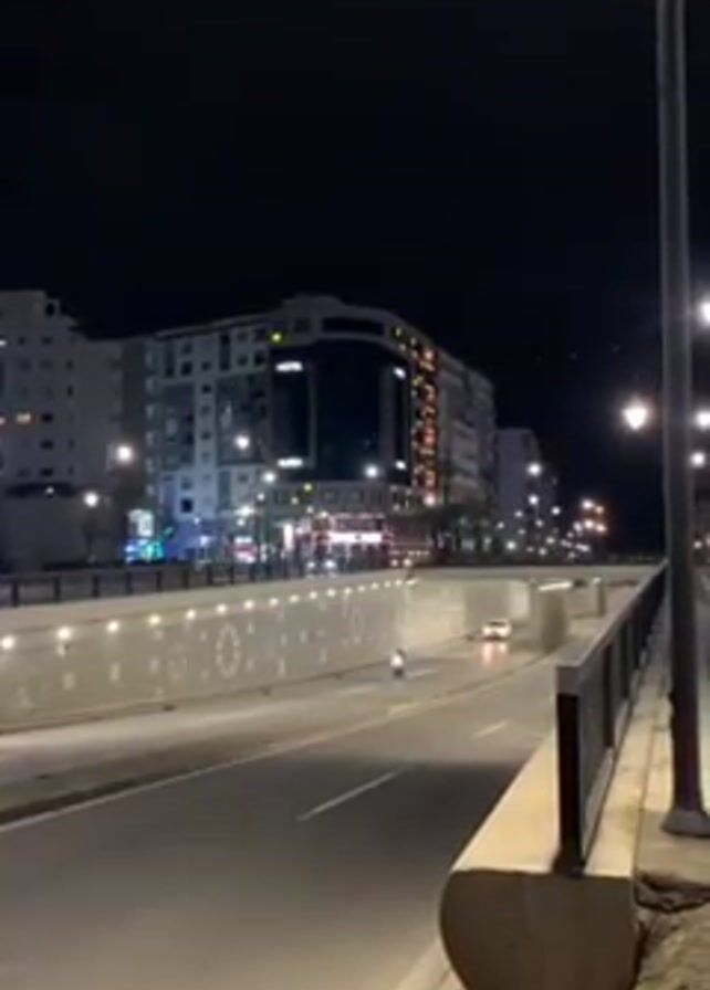 nighttime urban scene. A road with a tunnel underneath the main street is visible. Cars and a scooter are driving on the road. Buildings are lit up in the background. A street light is on the right side of the frame.