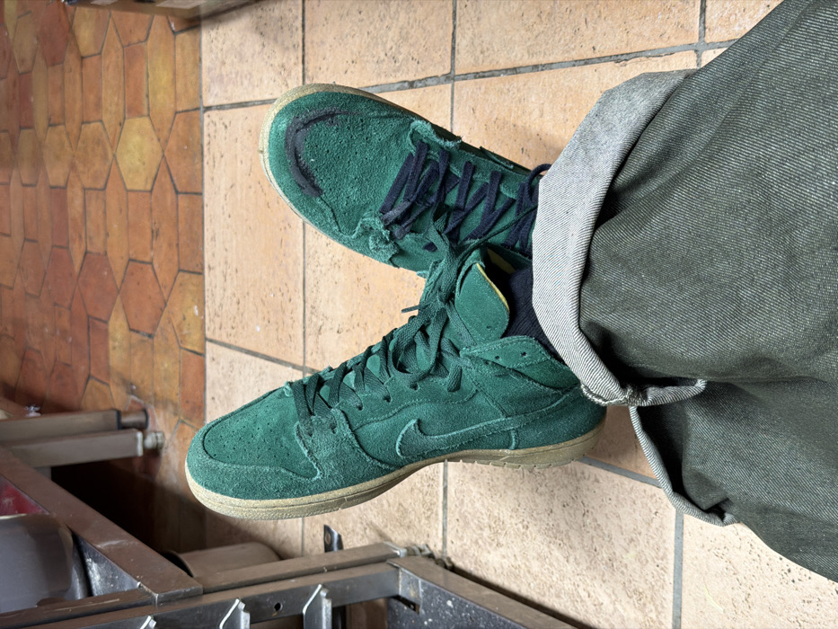 The image displays a first-person perspective of a person's lower legs and feet within an indoor commercial or industrial environment in La Salle-les-Alpes, France. The individual is wearing cuffed dark olive-green trousers, black socks, and a pair of worn green suede high-top sneakers with dark laces and light-colored soles. The right sneaker, positioned to the viewer's left, shows significant scuffing on its toe box. The floor consists of hexagonal terracotta-colored tiles with visible grout lines. In the background to the left, a section of a stainless steel shelving unit or counter is visible, indicative of a commercial utility space.