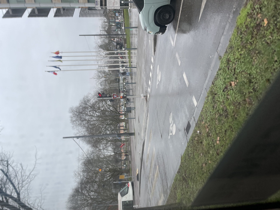 A rainy street scene features a bicycle lane and pedestrian crossing. A light-colored car partially visible in the upper right. Several flagpoles bearing various flags stand along the street, adjacent to bare trees. A traffic light shows red. A bus is seen in the distance at an intersection. Buildings are partially visible in the background under an overcast sky.