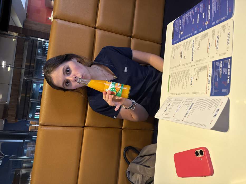 A woman sits at a restaurant table with a tan booth seat. She drinks a Boing juice bottle. A large, open menu with blue and white text lies on the table, displaying food categories like "TACOS," "QUESADILLAS," "BEBIDAS," and "POSTRES." A red cell phone rests beside the menu. A gray bag is visible beneath the table.
