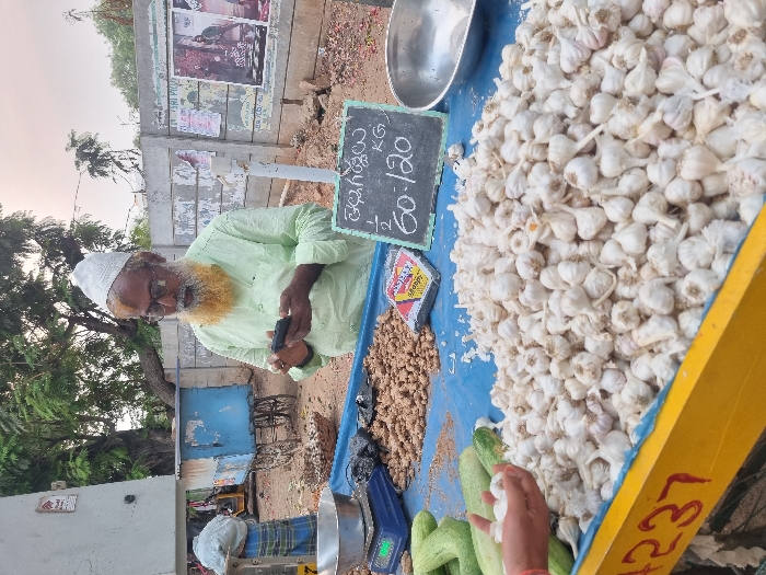 The scene depicts an outdoor market stall in Enumulapalli, India. An elderly male vendor, wearing a white skullcap, glasses, a light green long-sleeved shirt, and a prominent dyed yellow/orange beard, stands behind a market stall. He is actively engaged with a black smartphone held in both hands. The stall features a yellow base with the number "4237" painted on its front, topped with a blue tarp. On the tarp, a large pile of white garlic bulbs occupies the right foreground. To the left of the garlic, several green cucumbers are visible. A person's hand, partially visible in the lower left, holds a small cluster of garlic bulbs. Further back on the tarp, two smaller piles of irregular brown produce (possibly ginger or peanuts) are arranged. A blue weighing scale with a silver bowl rests on the left side of the stall. A small black chalkboard sign with white Telugu script reading "తెల్లగడ్డలు" (Garlic) and "KG 60/120" is positioned in the center. A silver bowl is present on the right side of the stall. In the background, a concrete wall covered with various posters, including movie posters, forms a backdrop. Dirt ground is visible, along with several trees and a blue cart with a metal top to the left of the vendor. The sky appears overcast.