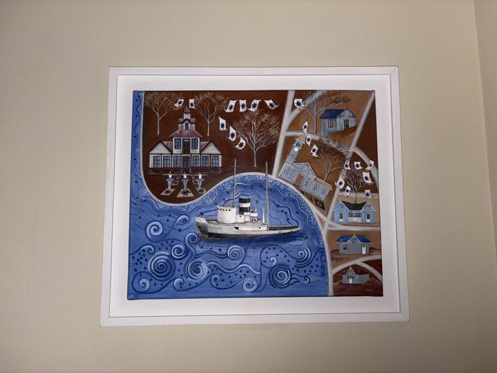 A framed painting hangs on a light beige wall. The artwork features a boat navigating blue waters with swirling patterns. On a brown background, various buildings are depicted, connected by light-colored pathways, interspersed with trees and flags with a star on them. Dancers seem to be in front of a big, brown building. The painting is enclosed in a white frame.