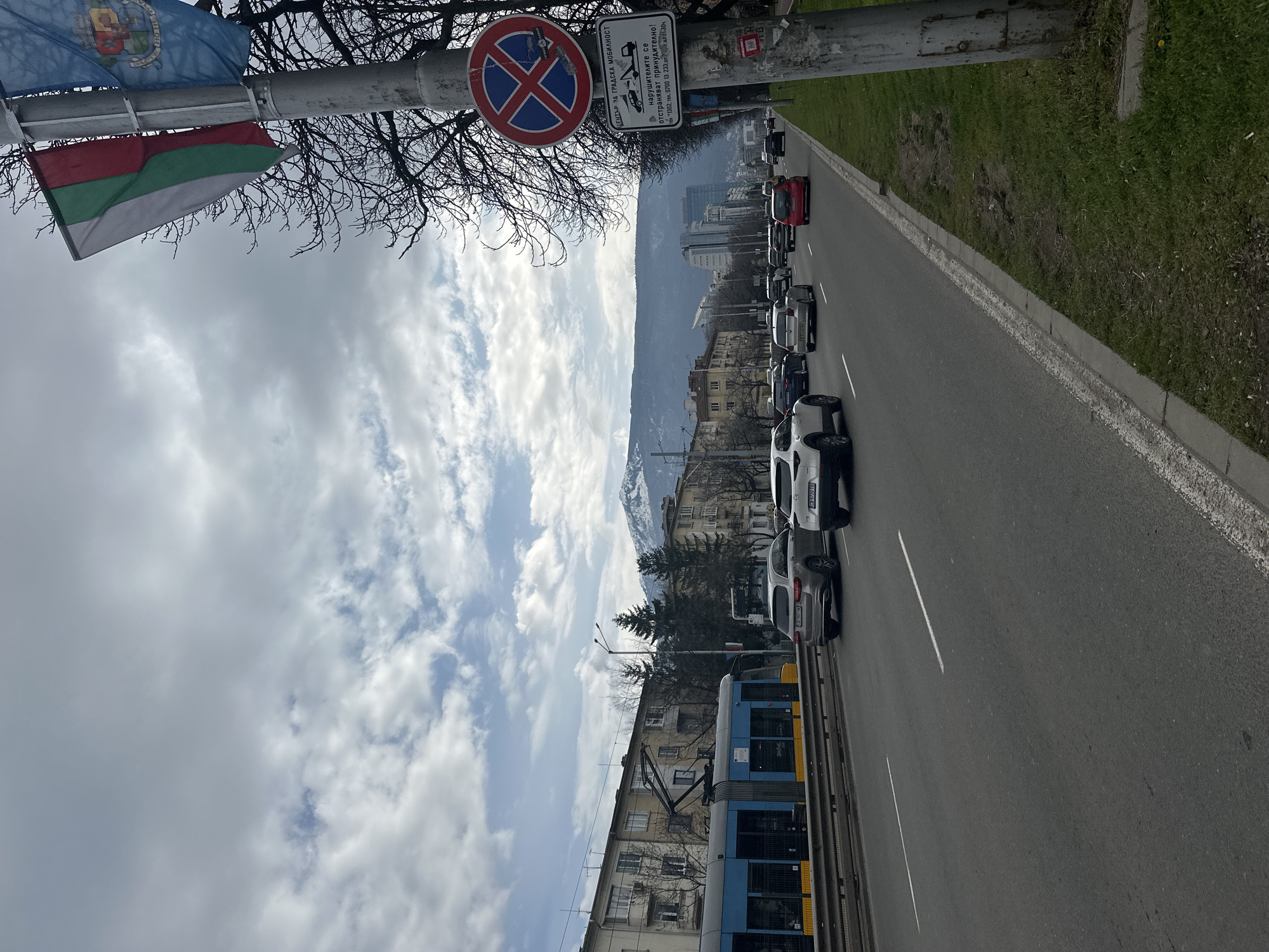 street scene in Sofia, Bulgaria, notable for a row of parked cars lining the right side of the road. A blue and yellow tram runs along the left side. The background features a mountain range under a partly cloudy sky. A street sign pole is visible in the foreground, displaying traffic signs. The Bulgarian flag and the flag of the Municipality of Sofia are attached to the same pole. The road appears to be a main thoroughfare, and some buildings are visible on both sides of the street.