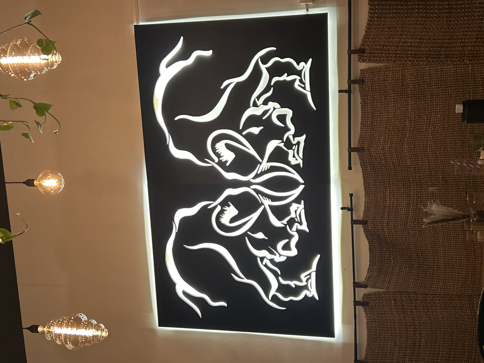 The image displays the interior of a restaurant, identified as Miznon, located at Schottenring 19, 1010 Vienna, Austria. A prominent, large rectangular backlit sign centrally adorns the wall, featuring a white glowing outline on a black background. The design is a symmetrical composition of two stylized, confronting bull-like figures, with additional abstract forms integrated within their outlines. Above the sign, the ceiling is visible, from which three pendant light fixtures hang. Two on the left are clear, textured glass spirals, while one on the right is a simpler spherical Edison-style bulb. Green plant vines are visible, suspended from the ceiling near the lights. Below the illuminated sign, a dark horizontal rod supports two textured panels made of woven brown natural fiber, likely jute, serving as decorative partitions or wall coverings. A partial view of a table is visible at the bottom edge of the frame, showing a glass with a striped straw, a dark bottle, and a small vase containing dried ornamental grasses. The overall lighting is dim, highlighting the glowing sign and pendant lights.