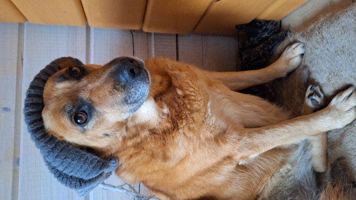 This image, captured in the city of Petriškė, Lithuania, displays a medium-sized dog seated indoors. The dog features reddish-brown fur, a lighter tan underbelly, dark brown eyes, and a black nose. It is positioned upright, facing slightly to its right, with its front paws resting on a textured, light brown or grayish rug. A dark, possibly patterned, fabric is partially visible beneath the dog's right leg. Adorning the dog's head is a grey, ribbed, knitted headpiece that covers its ears, from which a light-colored string or yarn dangles on the left side. The dog's gaze is directed forward and slightly upward. The immediate background consists of light-colored, horizontally planked wooden paneling to the left of the dog, and a vertical stack of light brown, rectangular objects, likely wooden blocks or panels, to its right.