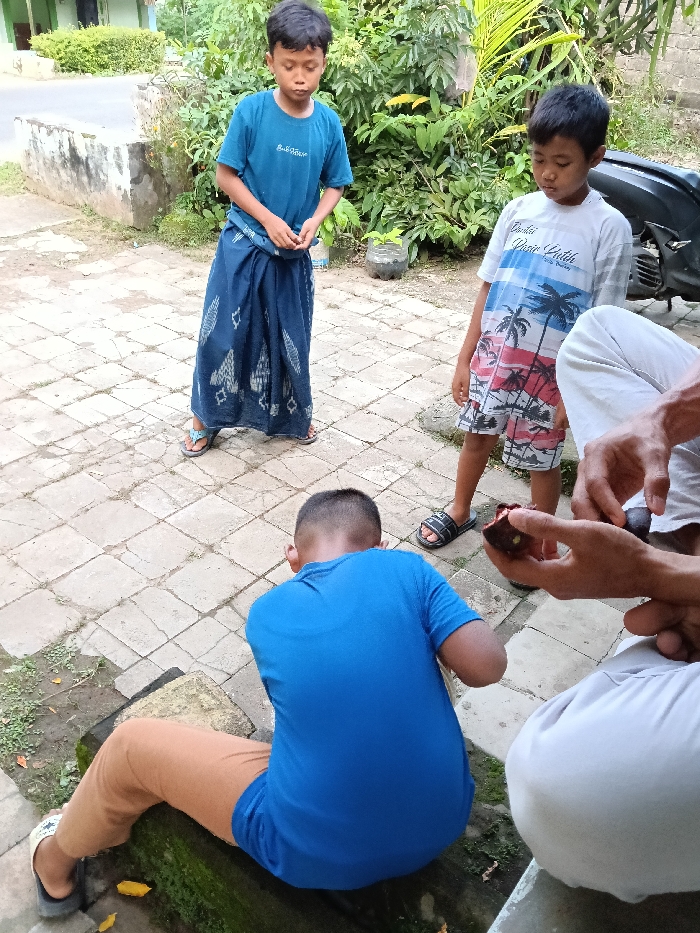 In Gunem, Indonesia, an outdoor scene depicts four individuals on a paved surface of square tiles. To the left, a young male, wearing a blue t-shirt and a dark blue patterned sarong with light blue flip-flops, stands facing forward with his gaze directed downwards. To the right of him, another young male, wearing a white t-shirt with a multi-colored palm tree graphic and patterned shorts, stands in black slide sandals, also looking downwards towards the right. In the foreground, a third young male is seated on a low concrete ledge or step, facing away from the camera. He wears a blue t-shirt, light brown pants, and black and white patterned slide sandals. To his right, an adult's lower torso and hands are visible, also seated on the same ledge. The adult is actively peeling a dark purple, round fruit, likely a mangosteen, with their bare hands. The background features lush green foliage and bushes. A section of a paved road or pathway is visible to the far left. A black scooter or motorcycle is partially visible behind the standing boy on the right. A plastic bottle repurposed as a planter is discernible among the vegetation.