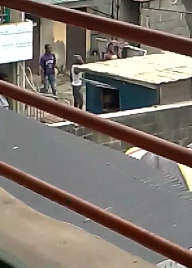 From an elevated perspective through orange railings, two men are visible in a densely populated area with buildings made of various materials, including corrugated metal. One man wears a purple shirt and jeans, while the other has on a white tank top and shorts. The man in the tank top appears to be gesturing or pointing. The buildings appear to be in a state of disrepair.