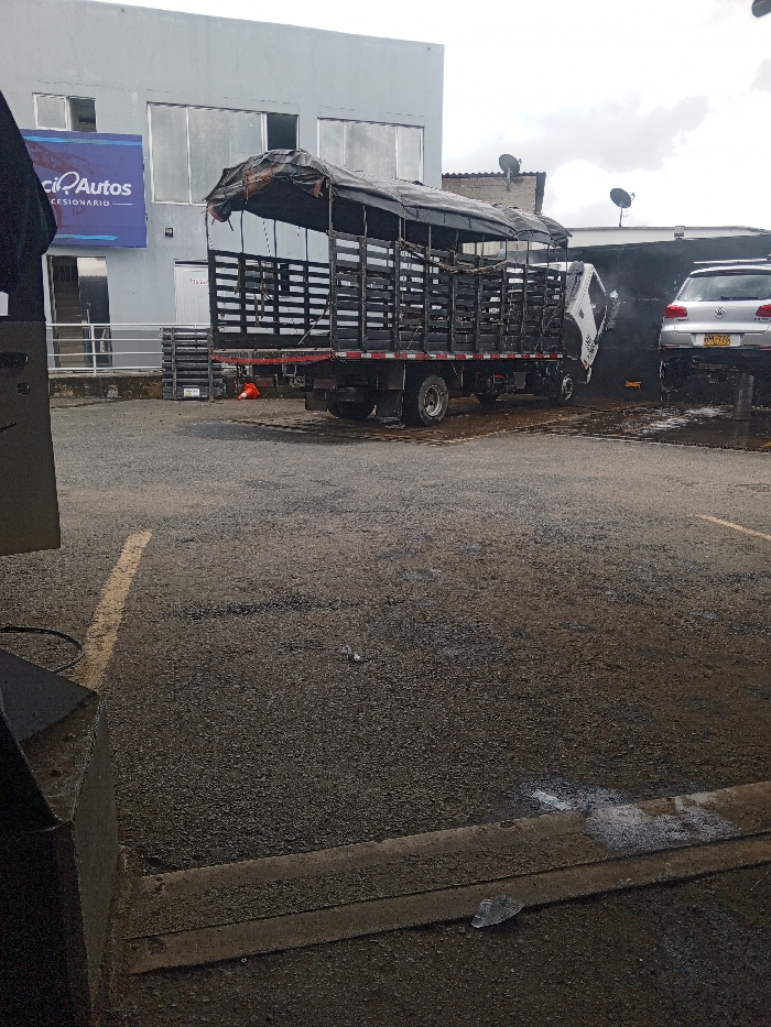 A black flatbed truck with a wooden slat enclosure is parked on wet asphalt. Behind the truck, a silver SUV undergoes a car wash, water spraying from the front and rear. To the left, a modern gray building displays a "cilAutos" sign above its entrance. The parking area shows wear and tear, including puddles, cracks, and discarded debris. The scene conveys a sense of a commercial vehicle cleaning operation.