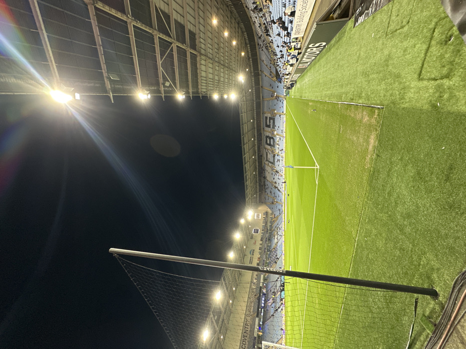 The image depicts the interior of the Coventry Building Society Arena, a football stadium located in Coventry, United Kingdom, at night