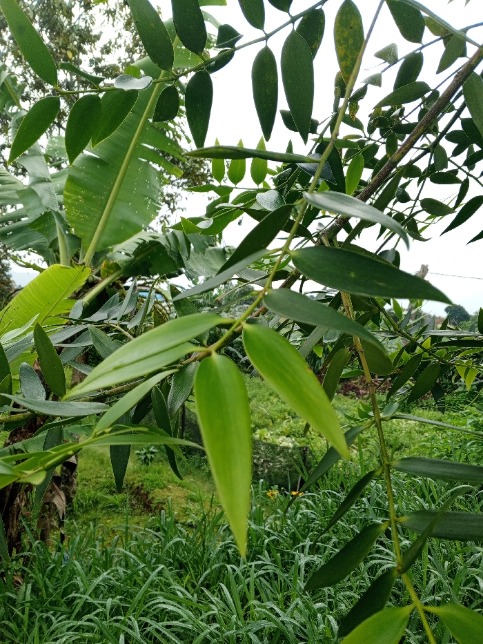A close-up shot reveals vibrant green foliage, featuring long, slender leaves cascading from thin branches. A large banana leaf adds a tropical touch. Dew-kissed grass fills the foreground, while a soft-focused background hints at a lush, green landscape. The scene conveys a sense of natural beauty and tranquility.