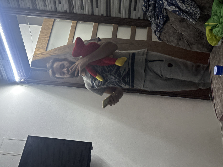 A man stands indoors, holding a red plush toy. He wears a grey patterned shirt and matching sweatpants. He also holds a phone in his hand. Behind him is a headboard, and to the right, a couch with a patterned throw and a green item on the side. A blue container sits on a table nearby. A television is visible in the lower-left corner. The room is simply decorated with a white wall.