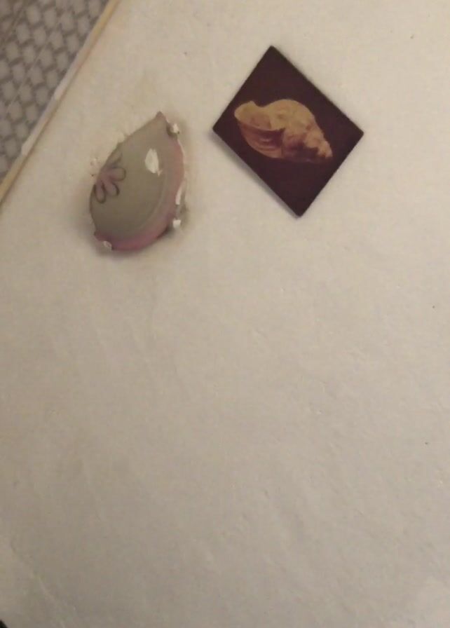 close-up, static shot of a white, textured surface. Near the top left corner is a small, decorated seashell, featuring a pink rim and a painted floral design. To the right of the seashell, there's a dark brown square with a sepia-toned image of a seashell on it, possibly a decorative magnet or tile. The rest of the frame is filled with the white, textured surface. Bird-like sounds can be heard in the background.
