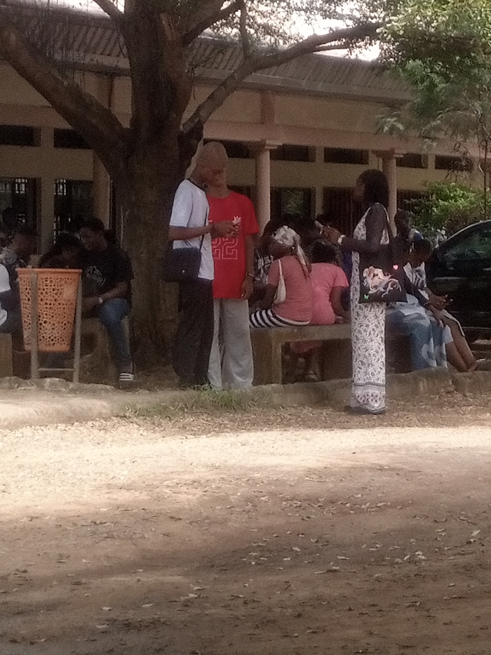 The image depicts a daytime scene in Awka, Nigeria, featuring multiple individuals congregated outdoors near a light-colored building with a dark, corrugated roof and visible support pillars. The foreground consists of a dirt ground with sparse vegetation and scattered debris. A large tree with a prominent trunk and branches provides shade in the midground. To the left, an orange, open-weave plastic trash receptacle is positioned on a metal stand. To its right, partially obscured by the tree, a male wearing a dark shirt and blue jeans is seated on a concrete bench. Beneath the tree, two male individuals stand. One wears a white short-sleeved shirt, dark trousers, and a black cross-body bag. The other, standing to his right, wears a red short-sleeved t-shirt with a white graphic (possibly "22") and light-colored wide-leg trousers. To the right of these standing individuals, a group is seated on a long concrete bench. A female wearing a pink top and black and white striped trousers is visible among them. Standing to the right of the seated group, a female in a long, white patterned dress, carrying a dark shoulder bag with a lighter graphic, is observed holding a mobile phone in her right hand. In the far right background, a dark-colored vehicle is partially visible, along with other partially obscured individuals seated further along the bench.
