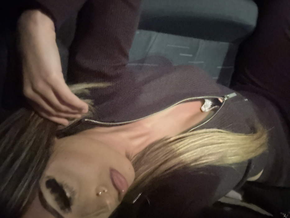 A person with blonde hair lies on a grey upholstered surface, possibly a couch. They wear a dark brown zipped sweater. The sweater is unzipped at the neck, revealing the skin of their chest. Their head is turned to the side, with lips slightly parted. One hand rests on the head, lightly touching the hair. There is a nostril piercing. The background is dark.