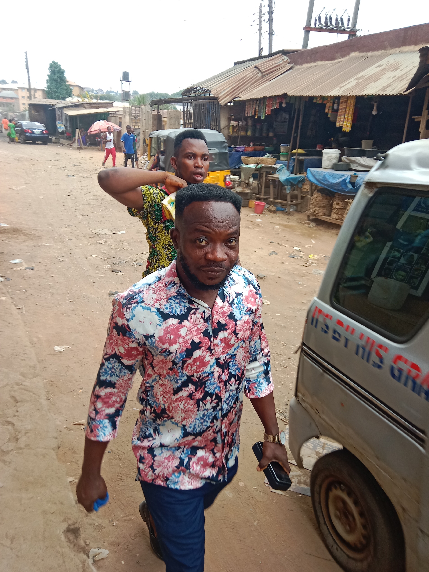 The image captures a bustling street scene in the city of Onitsha, Nigeria, under an overcast sky. In the immediate foreground, slightly right of center, a male individual with a short beard and haircut wears a patterned floral shirt (pink, blue, white, and black) and dark blue trousers. He walks forward, looking directly at the camera. His left hand holds a small blue object, and his right hand, adorned with a gold wristwatch, grips a black rectangular device, possibly a mobile phone. Directly behind him, to his left, another male individual with a similar short haircut wears a yellow, green, and black patterned shirt. His right arm is raised, with his hand near his head, and he looks towards the left side of the frame. To the right of the foreground, the rear-right section of a silver-colored minivan is visible, bearing red and blue text, partially reading "MISS THIS GRA" on its side, and displaying various printed images in its window. The ground beneath the subjects and vehicle is an unpaved, light brown dirt road with scattered debris. The background features a row of informal market stalls or shops with corrugated metal roofs, displaying various packaged goods, baskets, and other merchandise. Overhead, electrical utility poles with multiple wires and a transformer bank are present. A yellow motorized tricycle (keke napep) is parked near these stalls. Further down the dirt road to the left, more individuals are visible, including one person holding a red umbrella, another in a red shirt and red pants, and one in a blue shirt. A dark-colored sedan is parked further down the street. Distant structures, green foliage, and a water tank on a stand complete the background, indicating a dense, commercially active urban environment.