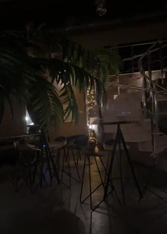 n outdoor area at night, likely a patio or deck, with tall tables and stools arranged under large palm leaves