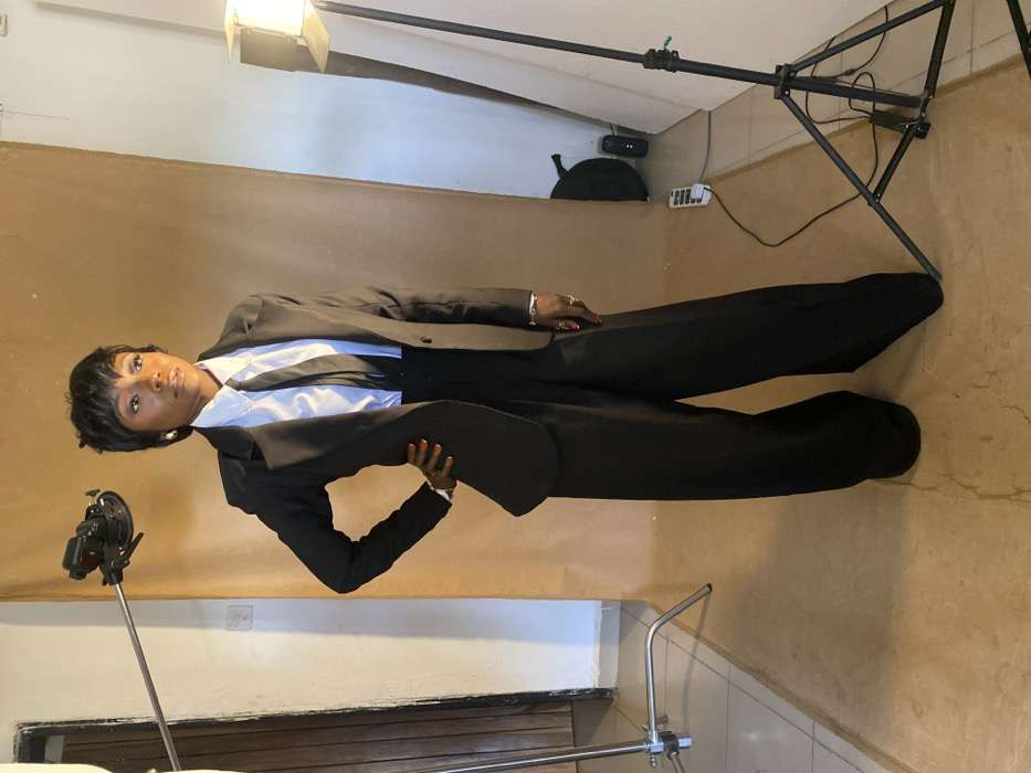 An indoor photo studio in Bukuru, Nigeria, features a female subject posing against a seamless brown backdrop. The subject, a Black female with short, dark hair, is dressed in a black pantsuit, consisting of a white collared shirt, black tie, black blazer, and wide-leg black trousers. She wears gold stud earrings, a silver-toned bracelet on her left wrist, multiple rings on her right hand, and red nail polish on both visible hands. Her head is turned slightly to the right (viewer's left), and her right hand rests on her hip. Studio lighting equipment is present on both sides: a silver light stand with an attached light fixture on the left, and a black tripod stand with a rectangular light panel on the right. Additional studio items, including a black bag, a black cylindrical object, and a white power strip with cables, are visible on the floor in the background to the right.