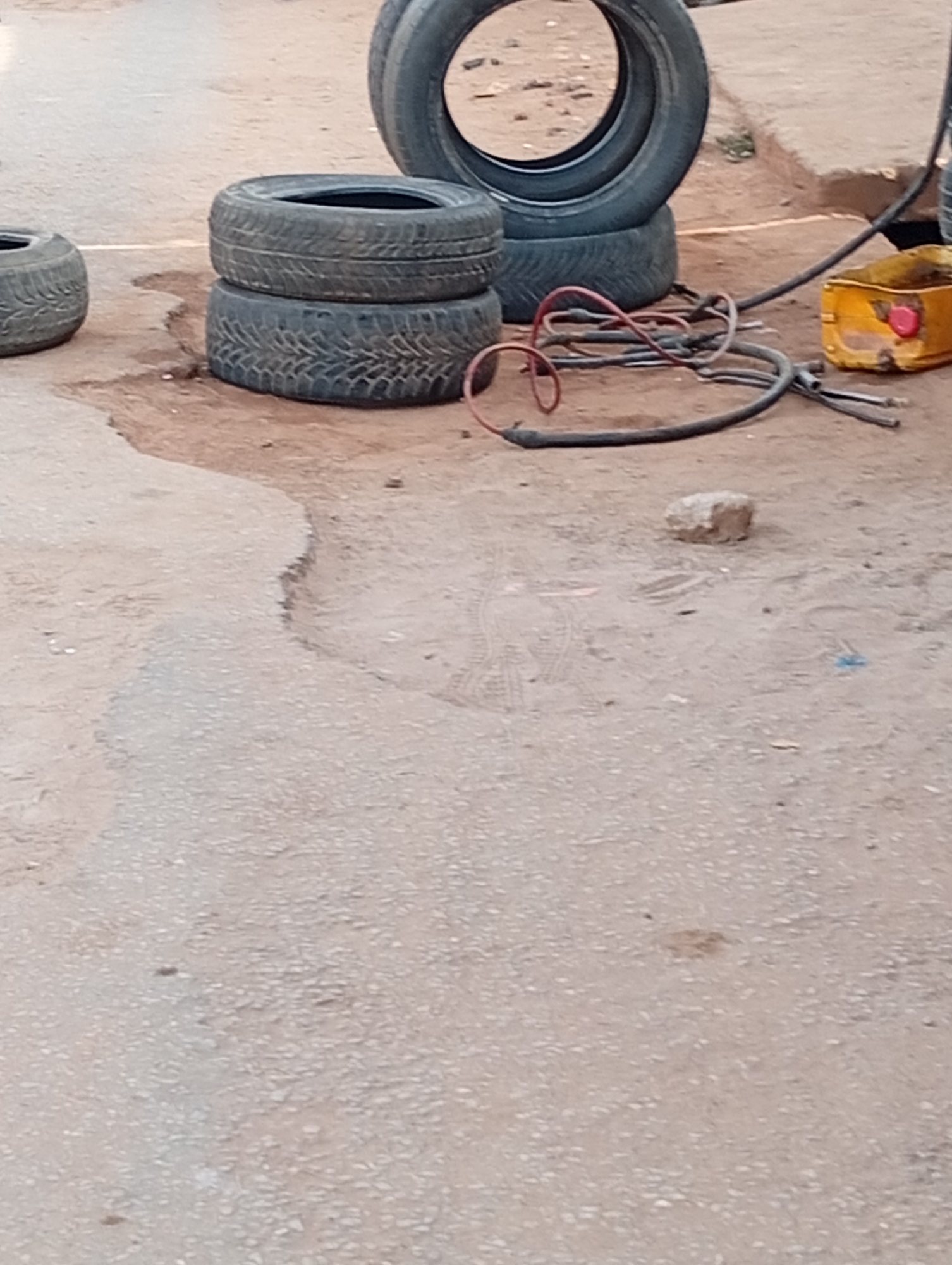 This image depicts an outdoor tire repair or maintenance area in Sabon Tasha, Nigeria. The scene is dominated by several used vehicle tires and related equipment situated on a mixed ground surface. In the foreground and mid-ground, the ground transitions from a lighter-colored, coarse-grained, possibly worn asphalt or concrete surface on the left to a reddish-brown dirt or soil patch on the right. A distinct, uneven boundary separates these two ground textures. A single, light-colored, irregular rock rests on the dirt patch in the mid-ground. From left to right, there are multiple tires: * One dark-colored tire lies horizontally on the lighter ground surface, partially visible on the far left. * Two dark-colored tires are stacked vertically on the reddish-brown dirt in the mid-left. Both display visible tread patterns and signs of wear. * Two more dark-colored tires are stacked vertically on the right side, positioned on the dirt. The uppermost tire is clearly visible, while the lower one is largely obscured by the upper tire and other objects. Adjacent to the stacked tires on the right, a tangle of flexible black and red hoses or cables lies on the dirt ground. These appear to be air hoses and possibly electrical lines associated with tire service. Further to the right, a yellow, rectangular container, resembling a jerry can, with a distinct red cap on its top, rests on the ground. Its surface shows signs of wear and dirt. The background is out of focus, suggesting an open, outdoor environment beyond the immediate working area. No individuals are present in the frame, and no specific actions or interactions are depicted. The scene is static, captured under what appears to be ambient daylight.