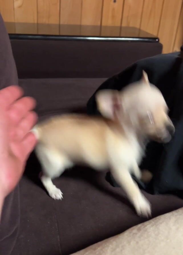 A short video shows a pale tan and white chihuahua puppy playing with a person’s hand on a brown couch