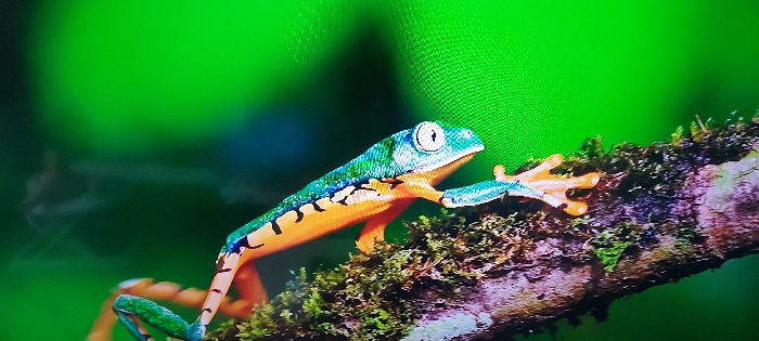 - "One brightly colored amphibian, identified as a tree frog, is centrally positioned on a moss-covered tree branch" by FM-KpKSC3, licensed under CC BY 4.0