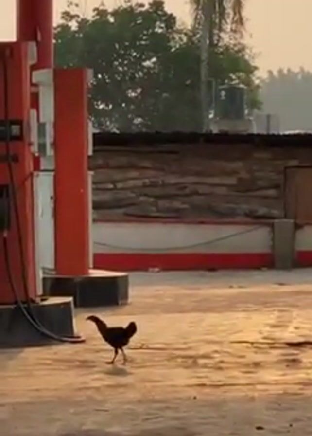 The video opens with a ground-level shot of a chicken walking on a concrete surface in what appears to be a gas station