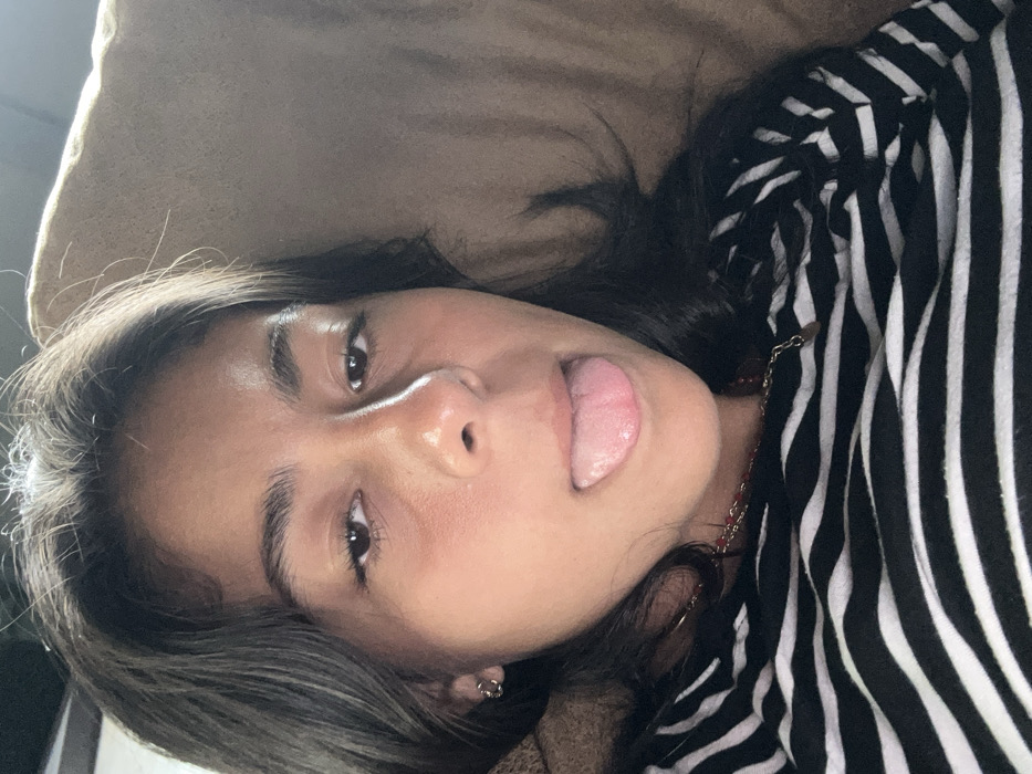 The image depicts a close-up, slightly upward-angled view of a single individual, presumed to be in San Bernardino Tlaxcalancingo, Mexico. The subject is a female with medium-to-dark brown hair, dark eyes, and a medium skin tone, facing directly towards the camera. Her tongue is extended outward and slightly downward in a playful or informal gesture. She is wearing a black and white horizontal striped long-sleeved shirt. A small, silver-colored hoop earring is visible in her left ear. A thin necklace, appearing to have red elements and a small metallic charm, rests on her upper chest, over the striped shirt. The background consists of a solid, light brown or beige textured fabric, likely a cushion or upholstered furniture, suggesting an indoor environment. No other individuals or significant objects are discernible. The lighting appears soft and even.