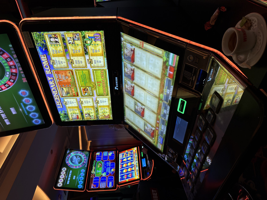 The image depicts an indoor casino environment in Ruse, Bulgaria, focusing on a close-up of a gaming machine