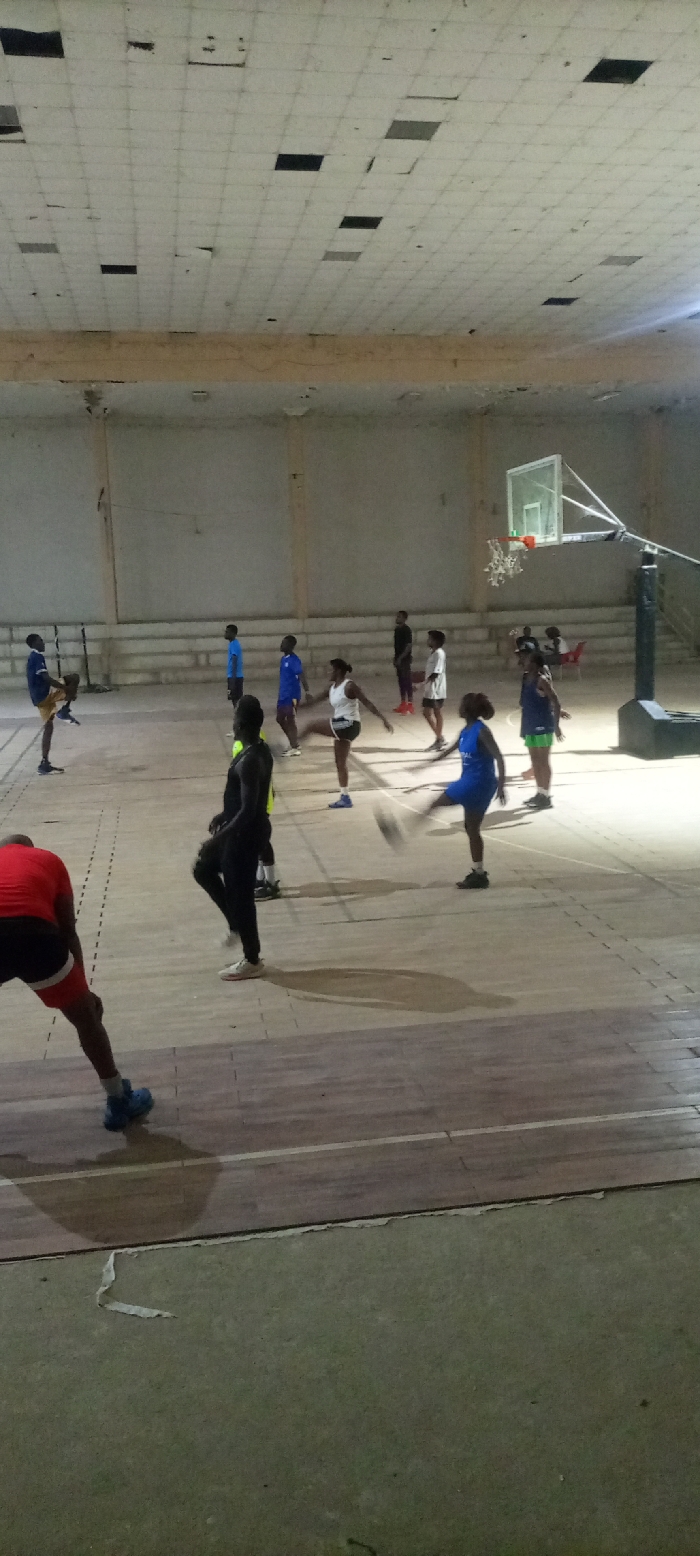 - "In a poorly lit indoor court with a basketball hoop, a group of young people in athletic attire are stretching and warming up" by FM-PJyUA2, licensed under CC BY 4.0