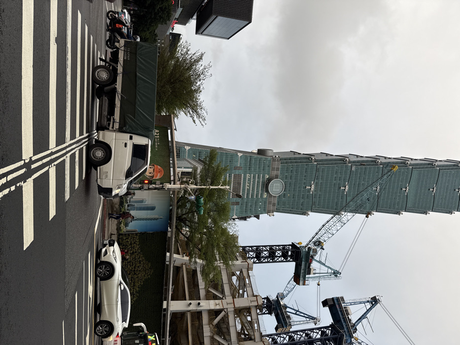 The image displays an urban street scene in Taipei, Taiwan, under an overcast sky. The prominent subject in the background is Taipei 101, a tall, segmented skyscraper with a green-tinted glass facade, including a large circular feature on a lower section. Adjacent to Taipei 101, a large-scale construction site is visible, featuring multiple tall tower cranes and an unfinished building structure with exposed steel framework. In the foreground and midground, a street intersection is depicted. A white utility truck, equipped with a dark green canvas tarp covering its bed, is positioned on the black asphalt road, partially over a white-striped pedestrian crosswalk which also has double solid white lines. To the right of the truck, a white crossover SUV (appearing to be an Infiniti QX30) is visible on the roadway. A black scooter with a rider is partially visible on the left side of the road, behind the truck. A red and white city bus is partially visible on the far right. A street light pole with active traffic signals (green for vehicular traffic visible) stands near the center. Pedestrians are observed on the sidewalks, particularly on the right side, near a construction hoarding. This hoarding features advertisements, one displaying a cartoon construction worker alongside "A21" text, and another showing a modern building rendering. Green foliage from trees and bushes is scattered throughout the scene. Other modern buildings are partially visible on the left.