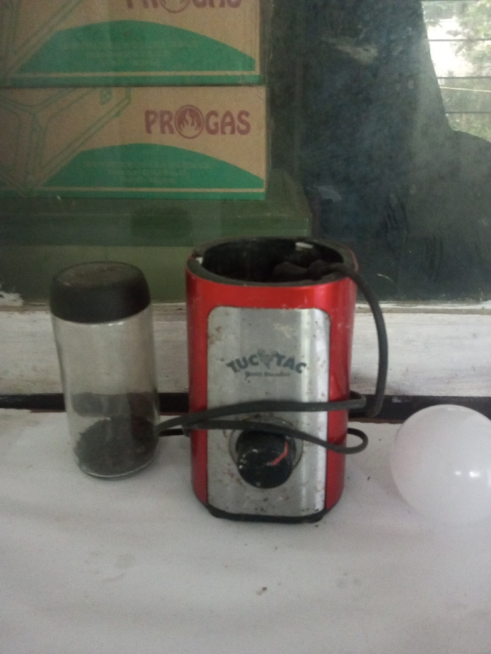 The scene is an interior shot within Fitsinjovana Bakaro, Madagascar, depicting objects on a light-colored surface, possibly a countertop or windowsill. In the background, two tan cardboard boxes with green semicircular designs are stacked, each bearing the word "PROGAS" and a circular logo. To the right of the boxes, a dark, reflective surface, likely a window, shows blurred green foliage outside. In the foreground, from left to right: 1. A clear glass jar with a black lid stands upright, containing a quantity of dark, finely ground or granular substance in its lower portion. 2. Next to the jar is a cylindrical, red and silver electric appliance labeled "TUC TAC". It has a black control knob on its silver front panel and a black electrical cord wrapped around its body. The top opening of the appliance contains several pieces of dark, lumpy material, resembling charcoal briquettes. 3. To the far right, a white, opaque, spherical light bulb rests on the surface. No people are visible, and no actions or interactions are depicted among the stationary objects. The surface beneath the items exhibits minor stains or debris.