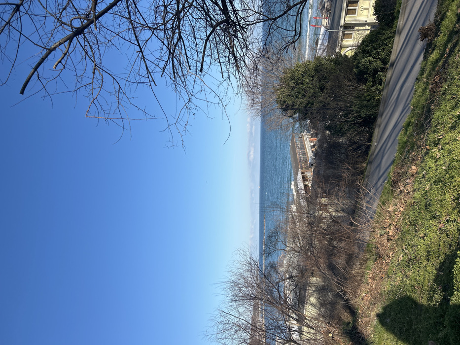 The image displays an elevated view of the Black Sea coastline in Varna, Bulgaria, likely captured from the Sea Garden area overlooking the beach. The top third of the frame shows a clear, bright blue sky. Below, the dark blue Black Sea extends to a distant horizon, with a concrete breakwater or pier visible extending into the water on the left side. Along the immediate coastline, multiple low-rise buildings are visible, including a prominent structure with a covered outdoor seating area, consistent with a beachside restaurant or cafe. The foreground features a downward-sloping terrain covered in sparse green grass, patches of dry leaves, and numerous deciduous trees and shrubs with bare branches, indicating a winter or early spring season. A paved pathway or road curves downwards from the lower-center to the right, showing distinct linear shadows cast by bright sunlight. A dark, amorphous shadow, consistent with a photographer holding a camera, is cast onto the grass in the lower-left corner. A dark, ornamental streetlamp is partially visible among the dense vegetation on the mid-right. No other individuals or specific interactions are discernible within the scene.