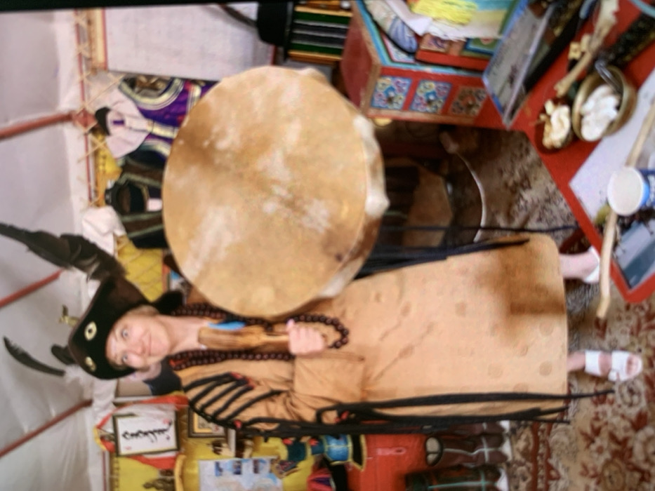 A single adult female, appearing Caucasian, stands inside a structure resembling a yurt with exposed wooden poles and light-colored fabric walls. She is wearing a long tan-brown robe with black braided or fringed details on the shoulders, a dark beaded necklace, and a dark, wide-brimmed hat adorned with two large, dark, horn-like or feather-like protrusions and two small, round, light-colored painted "eyes" on the front. She wears white sandals. The woman holds a large, circular, light-brown hide-headed drum with her left hand and a wooden drumstick in her right hand. She is looking forward with a smiling expression. The background features various objects: the left wall is partially covered with yellow fabric, displaying a white banner with dark script, and small dark statues or figurines. Further back, garments, including a patterned vest and a white-collared robe, hang on a rack. To the right, a brightly painted multi-colored wooden cabinet with intricate patterns is visible. In the immediate foreground on the right, a red table holds several small bowls containing white substances, a wooden utensil, and a blue and white cup. The floor is covered with a patterned rug. This scene is located in the city of Chaikovsky, Russia.